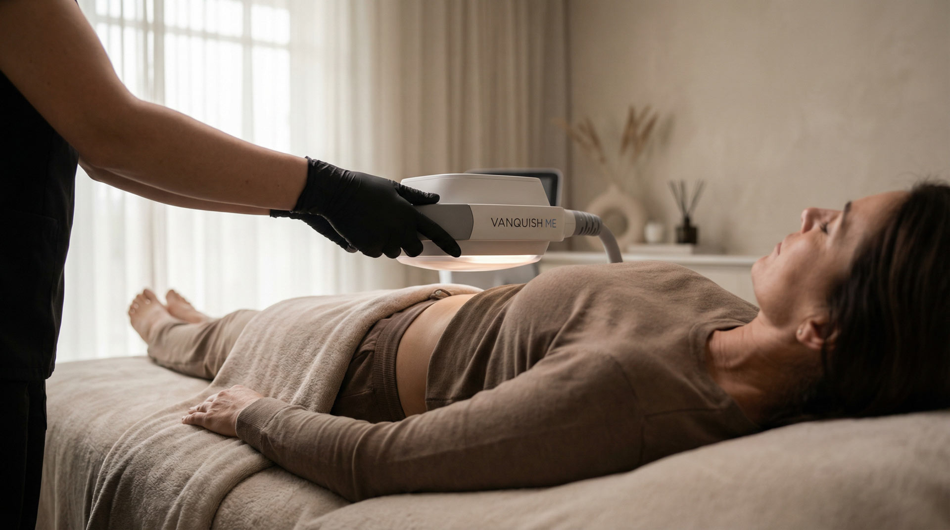 Vanquish ME es la revolución en el contorno corporal: es la única tecnología de radiofrecuencia de campo selectivo que elimina grasa sin contacto directo con la piel. Está diseñado para tratar grandes áreas como el abdomen y los flancos de una sola vez, destruyendo los adipocitos mediante calor.